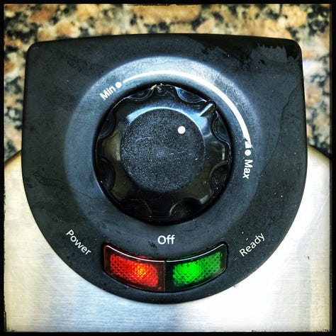Place the raw stuffleball in the center of a pre-heated lightly greased waffle iron. I heat mine to just past medium (see above photo) with a brand of cooking spray which rhymes with “ham”, which is now giving me another topping idea. Inspiration can come from anywhere.
