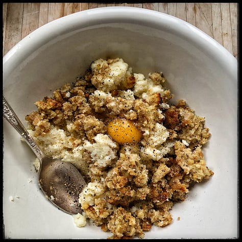 • Eggs. I generally use one, but if you’re making a lot, throw in a second. You want to bind the stuffing and potatoes together but you don’t want to wind up with eggy stuffles. Or do you? I don’t know your life.